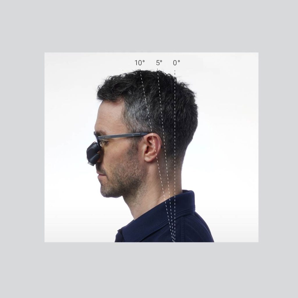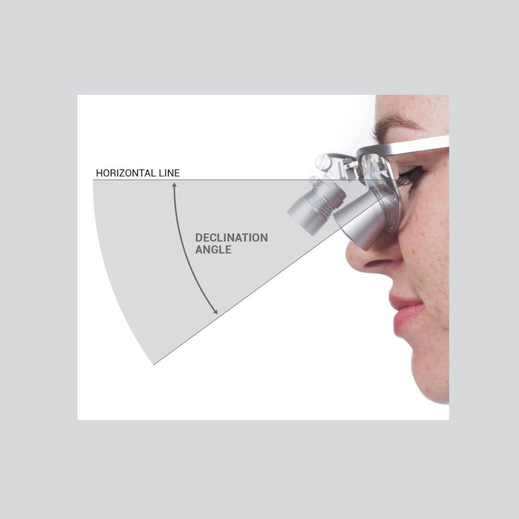 The declination angle is how your eyes incline downward toward your work area. A steep enough angle helps you maintain a comfortable posture with minimal forward head tilt (20° or less). If the head leans too far forward to see through refractive loupes, neck strain increases. Since the ideal angle varies based on face shape, frame, and nose bridge height, your ExamVision dealer customizes it for you.